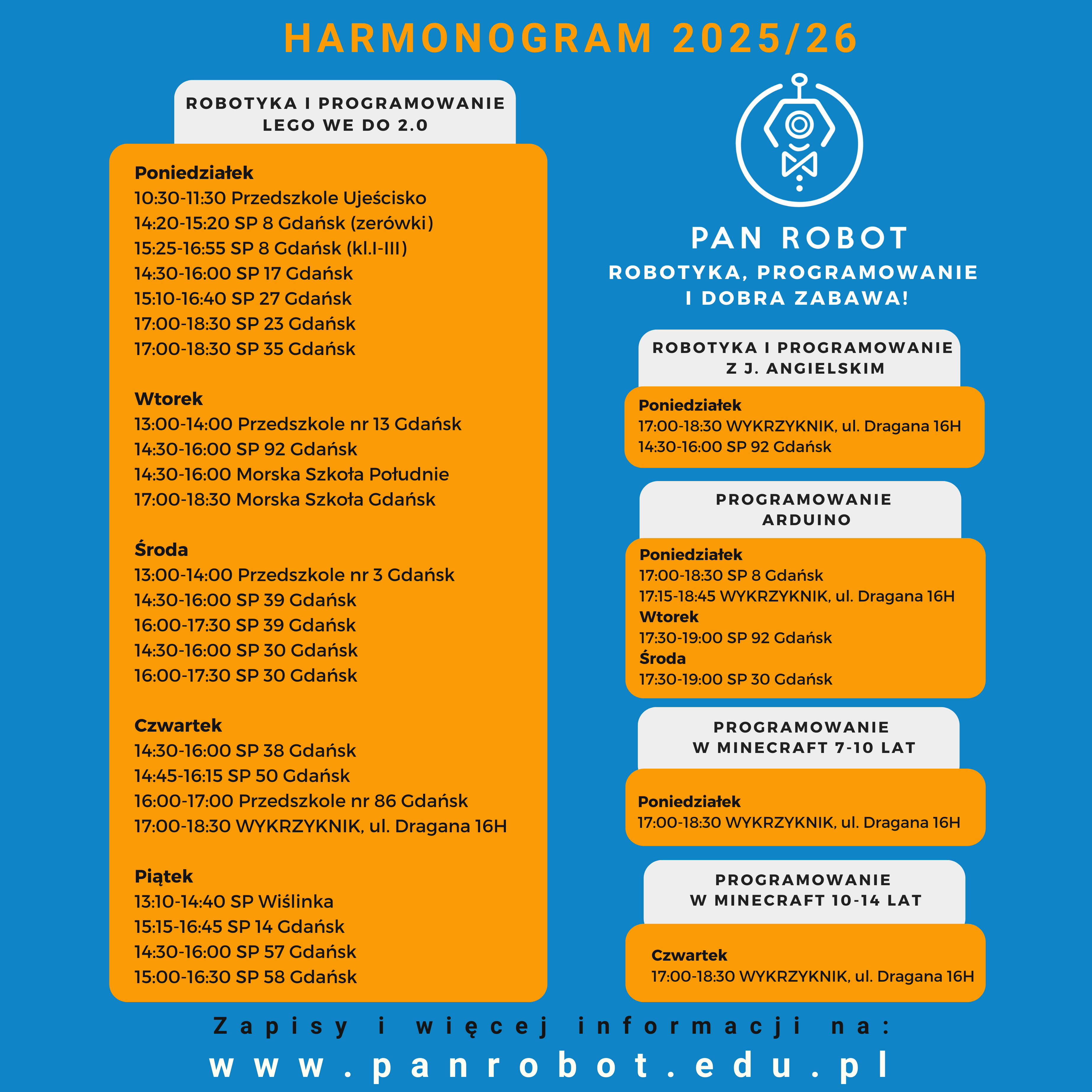 Półkolonia z nami to 5 dni nauki poprzez zabawę. Każdego dnia spotkamy się z nowoczesnymi technologiami: robotyka i programowanie, druk 3D, programowanie, drony, zajęcia z Minecraft. Zabawy ruchowe na świeżym powietrzu. Doskonalenie komunikacji i pracy w grupie.